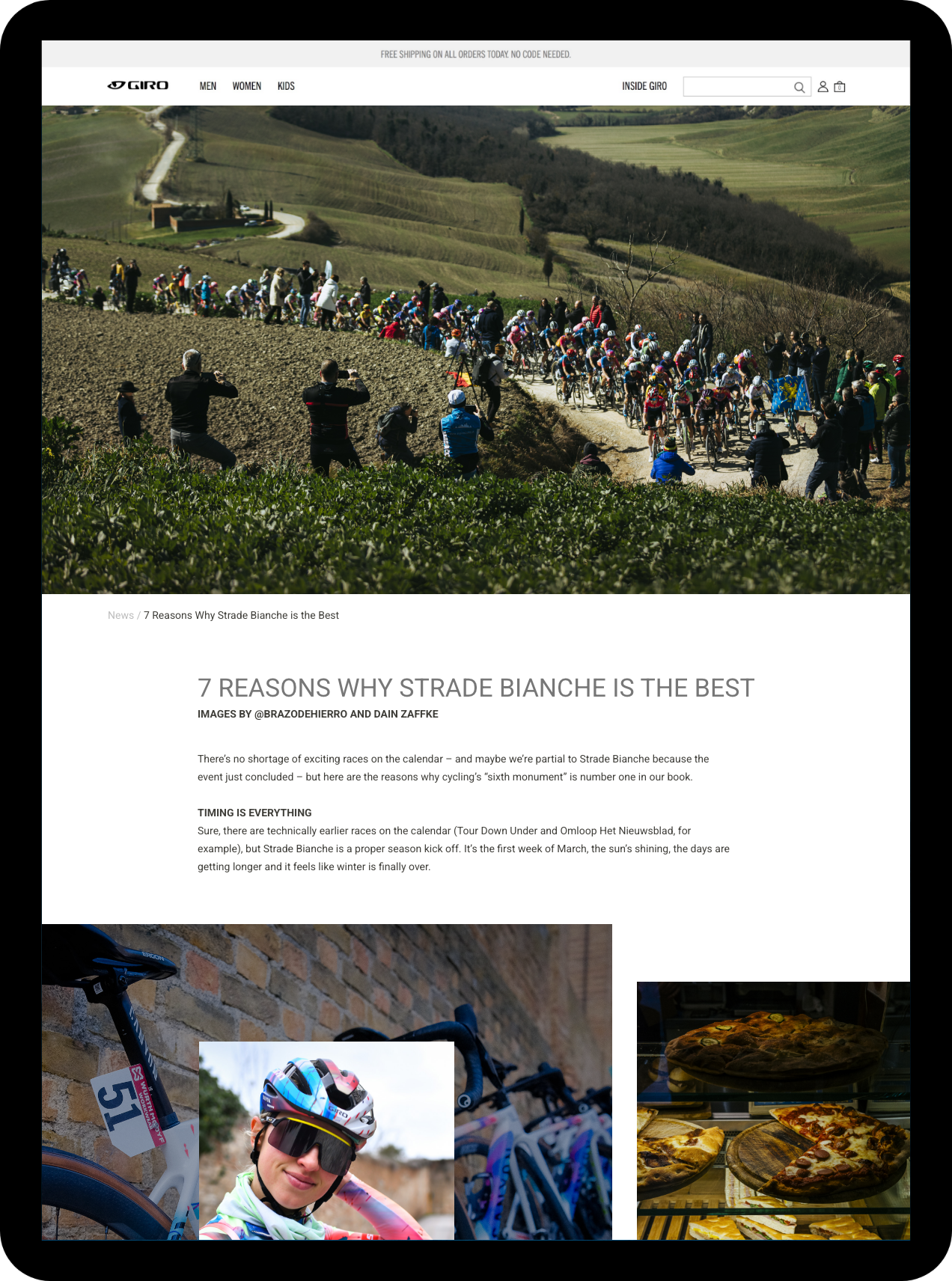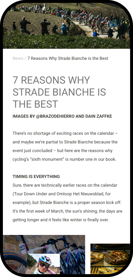 Strade Bianche is a renowned one-day professional cycling race through Tuscany, Italy, defined by its beautiful yet brutal gravel roads. I created social content and a feature news page for Giro.com to showcase the event and spotlight Giro’s sponsored athletes.